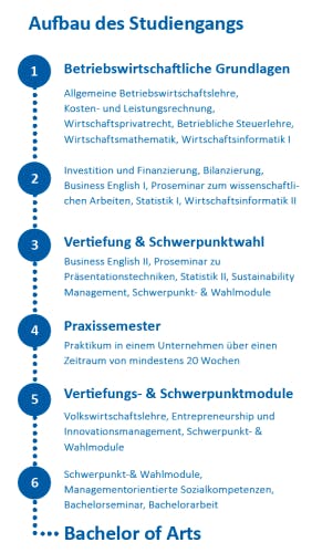 In dem Bachelor Studiengang Betriebswirtschaft wird der Praxisbezug unter anderem durch das in das Studium integrierte praktische Studiensemester (Praxissemester) hergestellt. Das Praxissemester ist ein wesentliches Element der Berufsqualifikation und ermöglicht den Studierenden anwendungsbezogene Fragestellungen zu bearbeiten. Es wird in einem Betrieb oder einer anderen Einrichtung der Berufspraxis mit einem Umfang von mindestens 20 Wochen abgeleistet.