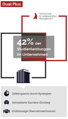 In Dual Plus verbringst du 42% deiner Studienzeit direkt im Unternehmen und wirst gleichzeitig für deine Arbeit bezahlt. Durch die Synchronisierung von Hochschule und Unternehmen sparst du 33% Zeit, entwickelst fortschrittliche Transferkompetenzen und beschleunigst deine Karriere, ohne dich zu überlasten. Die Studiengebühren übernimmt dein Partnerunternehmen aus unserem Netzwerk.