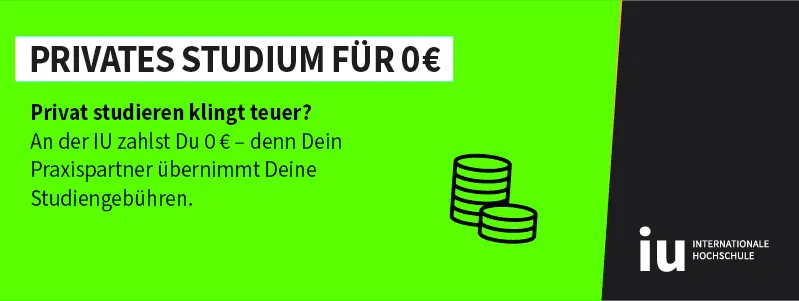 Hier können Sie kostenloses Informations­material zu diesem Studiengang direkt vom Bildungsanbieter IU Duales Studium anfordern. Die angegebenen Daten werden ausschließlich an diesen Bildungsanbieter übermittelt und selbstverständlich nicht an Dritte weiter gegeben.